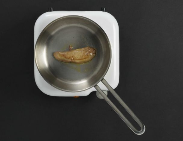 Colorer à la poêle le foie gras taillé en tranches épaisses assaisonnées. Le tenir froid a cœur. Refroidir sur papier absorbant et tailler en morceaux