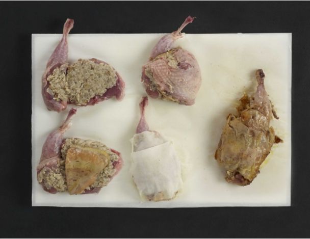 DifficileFlamber les cailles à la flamme. Lever les filets en supprimant totalement les ailes de façon à ne garder que le blanc. Lever également les cuisses. Les désosser en gardant l’os du pilon que l’on trousse avec les doigts pour le faire bien ressortir.