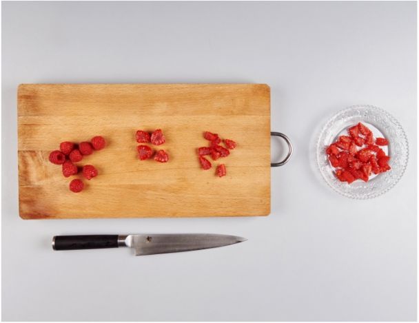 Tailler les framboises en quartiers, puis les mélanger aux autres fruits. Réserver.