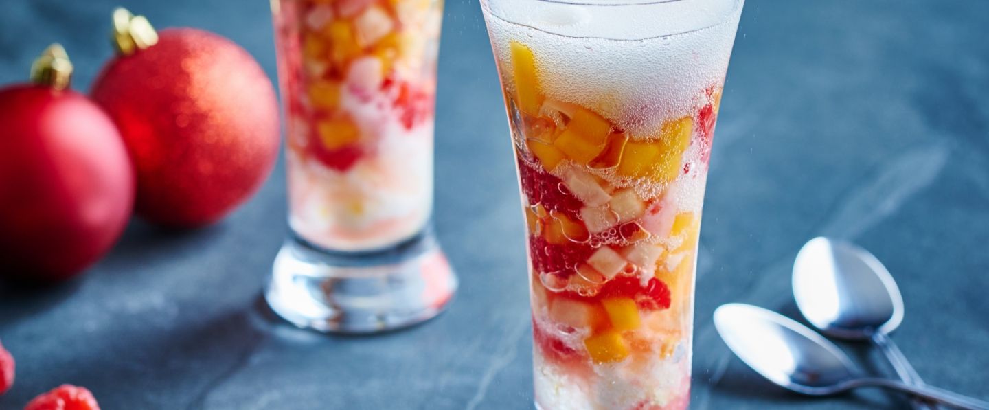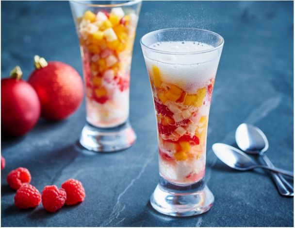 Répartir une boule de glace de vanille (ou de framboise) dans le fond de la coupe et ajouter la salade de fruits par dessus. Recouvrir de champagne frais au moment du service.