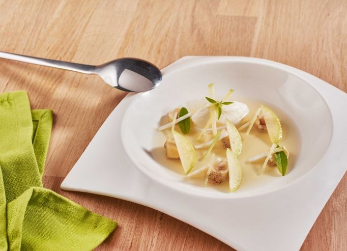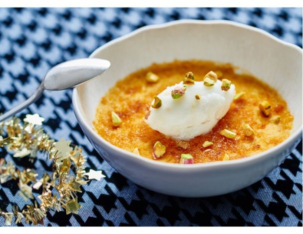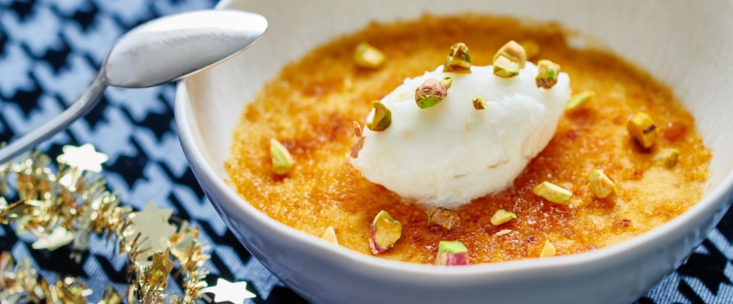 Réalisez une délicieuse crème brûlée au foie gras de canard, accompagnée d'un sorbet à la pomme verte et de pistaches.