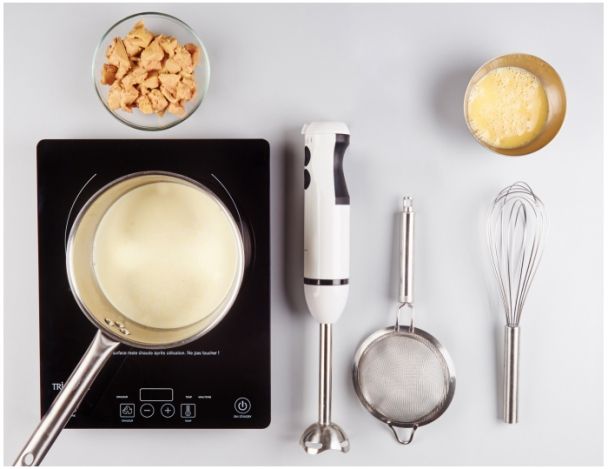 Porter le lait et la crème liquide à ébullition, ajouter le foie gras cru. Cuire à feu doux pendant 30 minutes environ, puis mixer et passer au tamis. Battre l'œuf et l'ajouter au mélange précédent, mixer, puis passer au tamis à nouveau