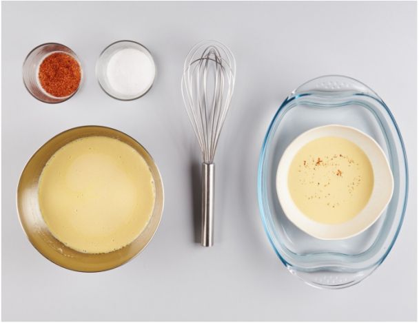 Assaisonner de sel et de piment d'Espelette. Verser cette crème dans des bols . Déposer les bols dans un plat, verser un fond d'eau. Faire cuire au bain-marie pendant 30 minutes environ dans un four chauffé à 190°C.