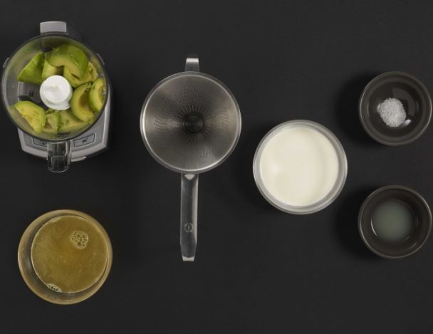 Rassembler dans un bol mixer la pulpe d’avocat, le bouillon de volaille et les assaisonnements. Mixer finement et chinoiser. Ajouter la crème, l’acide ascorbique (facultatif) et rectifier le gout si nécessaire. Réserver au frais.