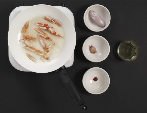 Laver et concasser les pinces de langoustine. Colorer à blond avec un peu d’huile d’arachide. Ajouter 1 gousse d’ail, 1 échalote et 1 pointe de couteau de concentré de tomate. Recouvrir à hauteur avec de l’huile et laisser infuser à peine à frémissement durant 30 mn. Filtrer. Réserver.