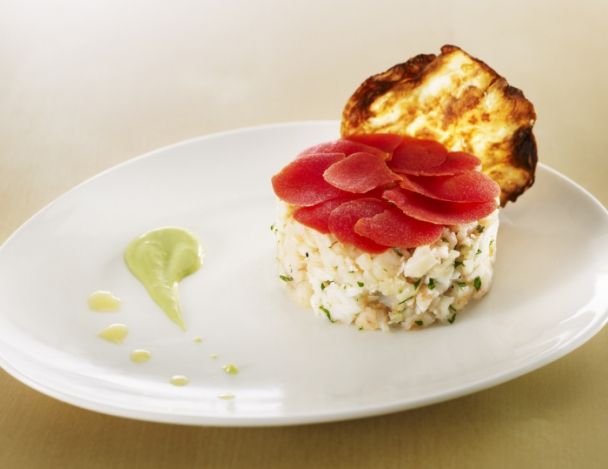 Poêler vivement à l’huile de crustacés, les langoustines décortiquées, que l’on concasse ensuite. Les tenir crues à cœur. Assaisonner avec un filet d’huile de crustacés, citron et coriandre ciselée.