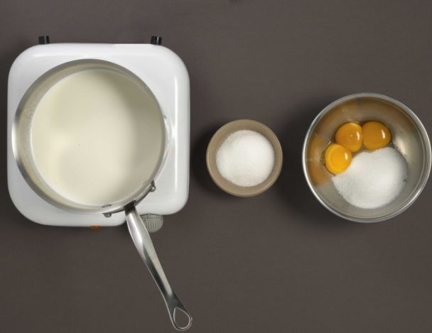TrèsFaire bouillir le lait avec la moitié du sucre. Mélanger les jaunes d’œufs avec l’autre moitié du sucre afin d’obtenir un ruban. Une fois le lait bouillant, versé sur le ruban. Ensuite cuire le tout à bain marie jusqu’à 84°C.