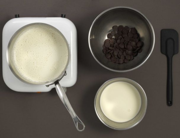 Une fois cuite, verser la préparation sur le chocolat en fin morceau. Mélanger de façon homogène. Mélanger la crème liquide, bien froide jusqu’à obtention d’une masse lisse. Mouler dans les récipients et conserver au frigo.