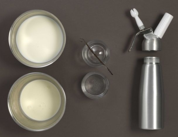 Mélanger les ingrédients. Verser ce mélange dans un siphon avec 2 cartouches de gaz et conserver cela au frigo.