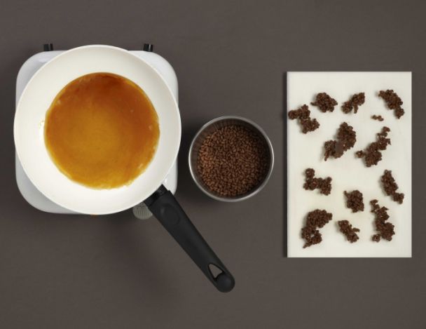 Réaliser un petit caramel avec le sucre Lorsque la coloration est dorée, rajouter les chocopops et bien mélanger le tout. Ensuite déposer sur une table et laisser refroidir .