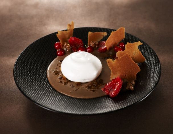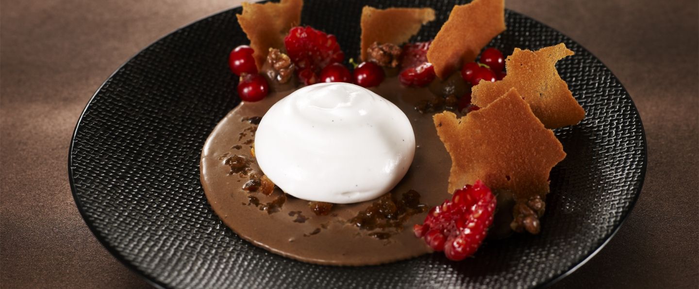 Placer le granité de café sur la crème chocolat, ensuite l’espuma de vanille. Comme décoration vous pouvez y poser un peu de riz soufflé caramélisé et des fruits rouges
