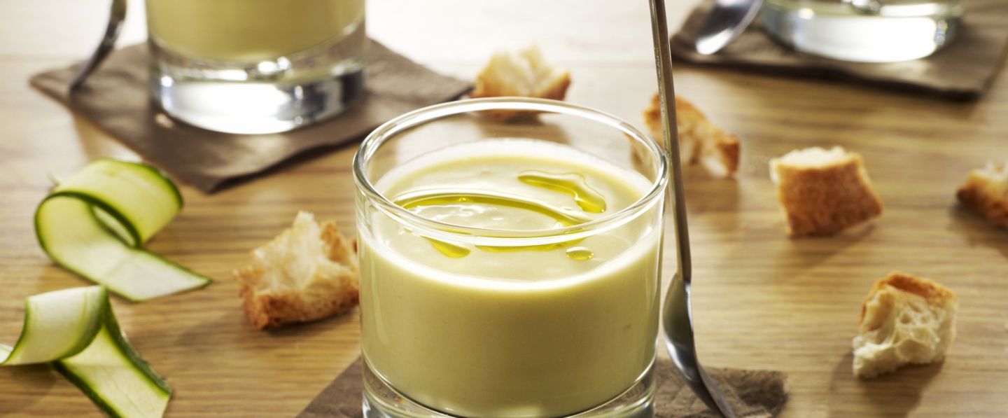 Verser dans un saladier. Laisser refroidir. Couvrir de film étirable et placer au moins 1 heure au réfrigérateur. Lorsque la crème est froide, la servir en l'arrosant d'une cuillerée à café d'huile d'olive avec des petits croutons aillés.