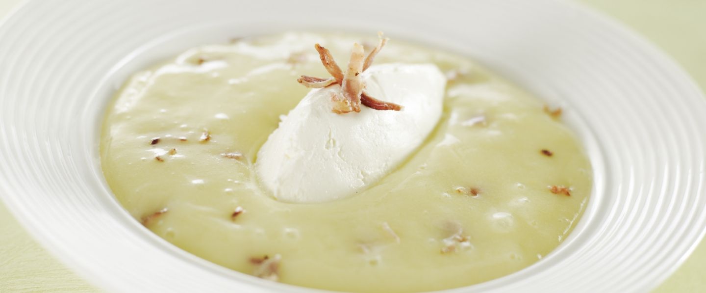 Servir le crémeux dans une assiette creuse, y déposer une belle quenelle de crème fouettée et quelques dés de lard fumé.