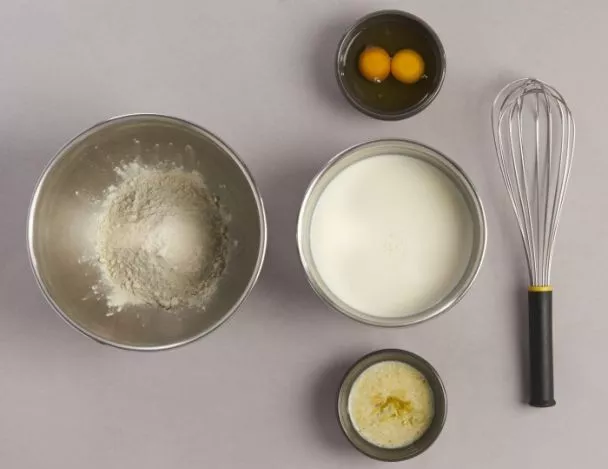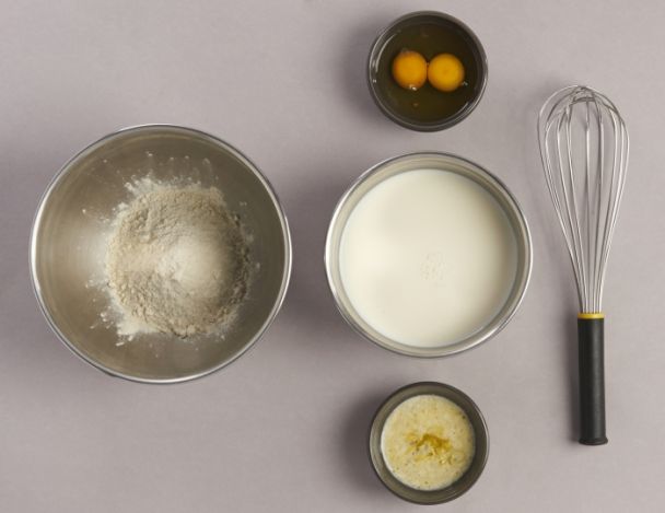 Réaliser la pâte à crêpes classique: Mélanger la farine, ajouter les œufs et le lait. Détendre au lait puis ajouter le beurre fondu avec le zeste.