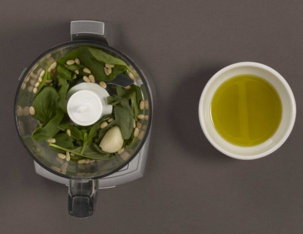 FacileMixer le basilic avec l’ail, les pignons de pin et l’assaisonnement. Monter progressivement à l’huile d’olives.