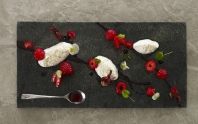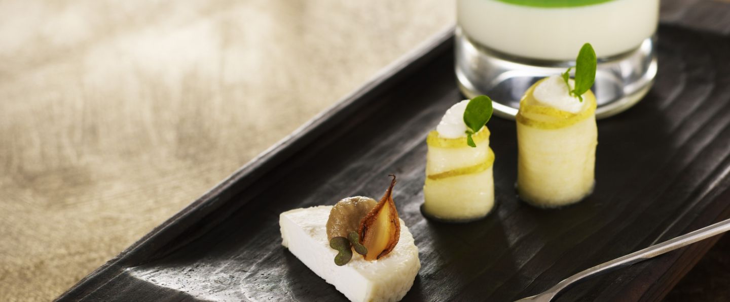 Sur 4 plateaux individuels, disposer harmonieusement une verrine de Panna Cotta, 2 rouleaux de poires farcies et quelques lamelles de Crottins de Chèvre au confit au d’oignons.