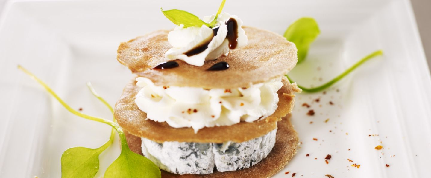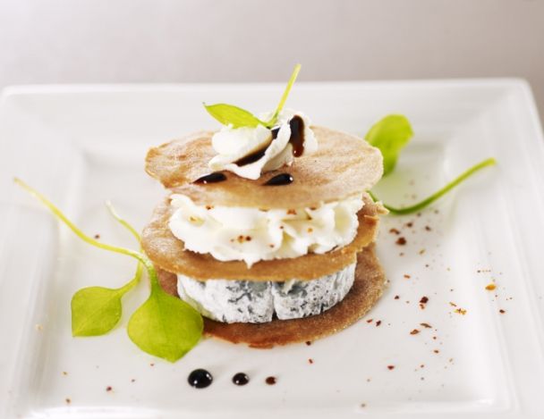 Coller une première tuile dans le fond d'une assiette , puis déposer a l'aide d'une poche une jolie rosace de chèvre, puis recouvrir d'une autre tuile. Ajouter au centre de cette deuxième tuile une tranche de sainte Maure et couvrir d'une troisième tuile. Servir avec quelques points de crème de balsamique noir et des pousses de saison.