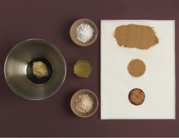 Faire un beurre pommade an ajoutant le sucre glace, puis incorporer petit à petit les blancs tout en fouettant énergiquement ; terminer avec la farine de sarrasin. La pâte obtenue doit être bien homogène. Pour la cuisson, étaler l'appareil sur une plaque en silicone, puis détailler des cercles à l'aide d'un emporte pièce. Cuire 6 à 8 minutes à 180° pour obtenir une jolie coloration dorée.