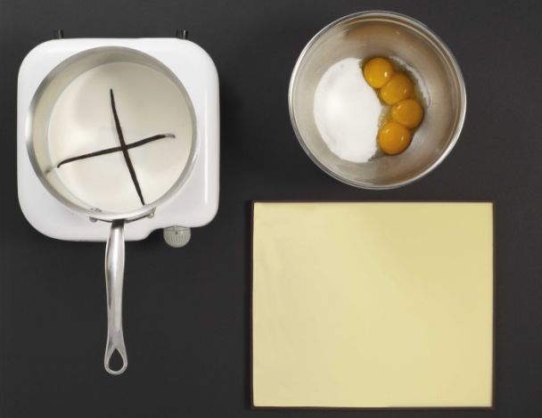 Faire bouillir la crème, le lait et les gousses de vanille et laisser infuser quelques heures.