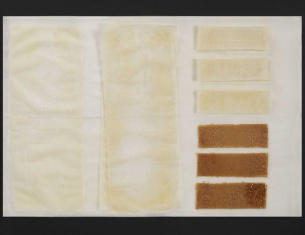 Découper des rectangles de 10 x 5 cm et les cuire au four à 180°C pendant 8 minutes entre deux plaques a pâtisserie.