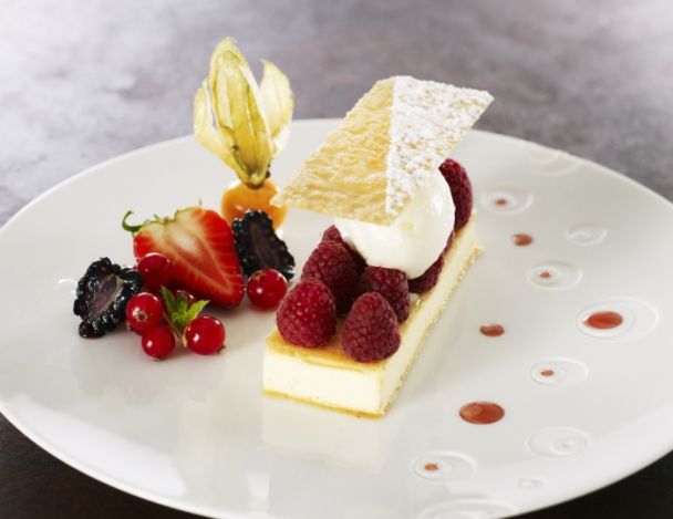 Décorer l’assiette avec les fruits et faire quelques points de coulis de fruits rouges.