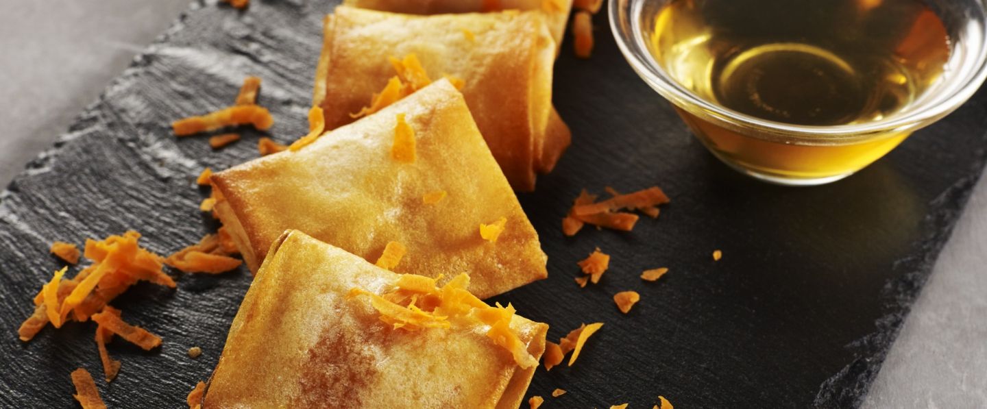 Préchauffer le four à th. 6 (180°C). Couper les feuilles de brick en deux. Poser au centre de chaque demi-feuille une crevette et les légumes, rabattre les bords l'un sur l'autre, puis plier en carré, de façon à enfermer la farce.