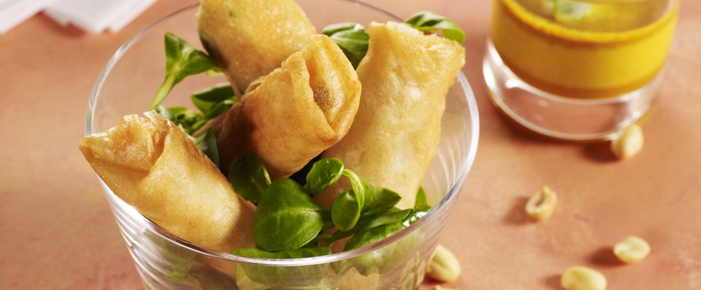 Pendant ce temps, chauffer le lait de coco dans une casserole avec le curry, en remuant. Concasser les cacahuètes au mixeur. Ajouter dans la sauce au dernier moment et servir les cigares avec la sauce.