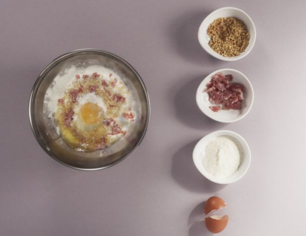 Concasser les cacahuètes, émincer les tranches de rosette, et mélanger les deux éléments avec l'œuf et la farine.