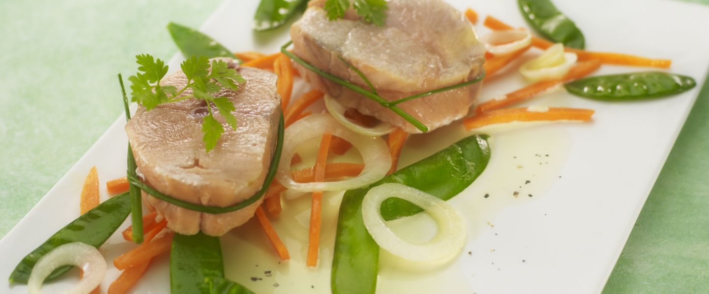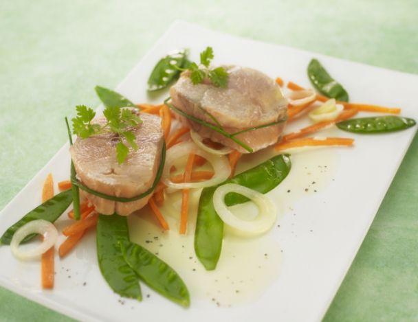 FacileCouper des tranches de 3 cm de largeur, enrouler et attacher avec un brin de ciboulette pour obtenir des darnes ou un filament de poireau blanchi. Cuire dans un plat en porcelaine beurré . Assaisonner de sel et de poivre.