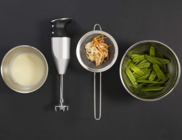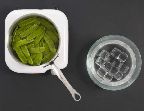 Équeuter et cuire les pois gourmands à l’eau bouillante salée puis rafraîchir à l’eau glacée.