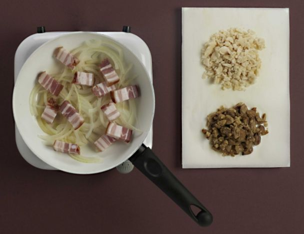 MoyenMixer la mie de pain, peler et émincer l'oignon. Concasser les marrons cuits. Mettre l'huile à chauffer dans une poêle et faire revenir l'oignon 2 min et la poitrine de porc. Assaisonner généreusement. Retirer du feu et ajouter les autres ingrédients, mélanger bien.