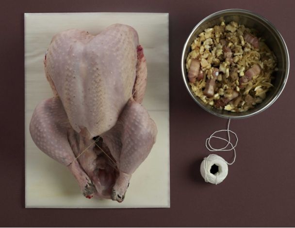 Rincer la dinde à l'eau courante et l'essuyer avec du papier absorbant. Farcir la dinde de farce et lui lier les pattes avec du fil de cuisine. Déposer la dinde sur la lèchefrite du four préalablement huilée, verser l'eau autour. Badigeonner d'huile d'olive.