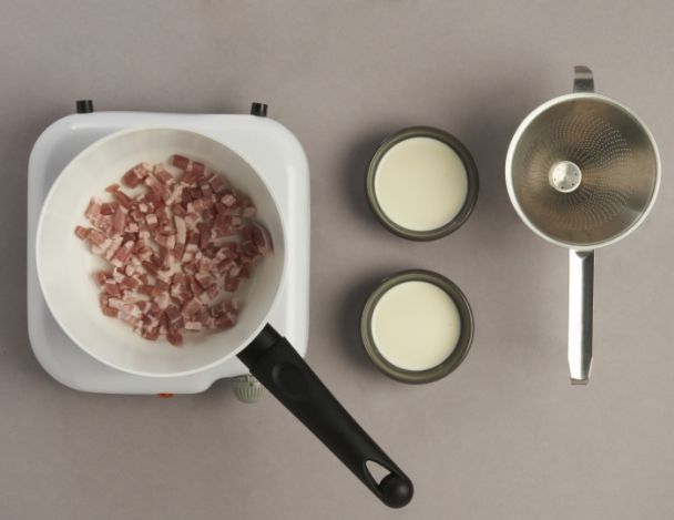 Suer légèrement à sec les lardons, mouiller avec le lait et la crème. Laisser cuire doucement à frémissement. Chinoiser.