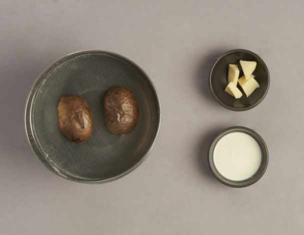 Cuire les pommes de terre en robe des champs au four. Tamiser la pulpe chaude de pomme de terre. Puis détendre 150 gr de pulpe de pomme de terre avec 50/60 gr de crème de lard à consistance crémeuse. Finir avec la pointe de beurre frais.