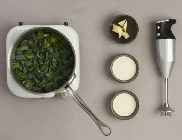 Ebouillanter une minute le vert de poireau et rafraichir a l'eau glacée. Rassembler les laits et la crème, porter à frémissement. Bien saler, beurrer et mixer au moment du dressage avec le poireau de façon à créer une mousse légère d'un beau vert tendre.