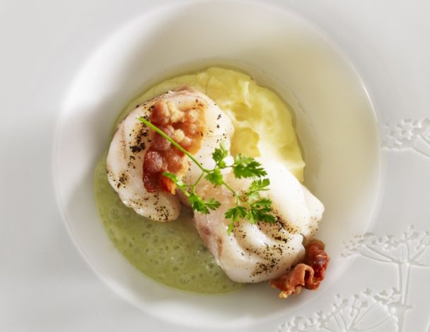 Disposer au fond des assiettes creuses un peu de crème de pomme de terre. Placer le poisson au milieu. Entourer avec l'écume de poireau.