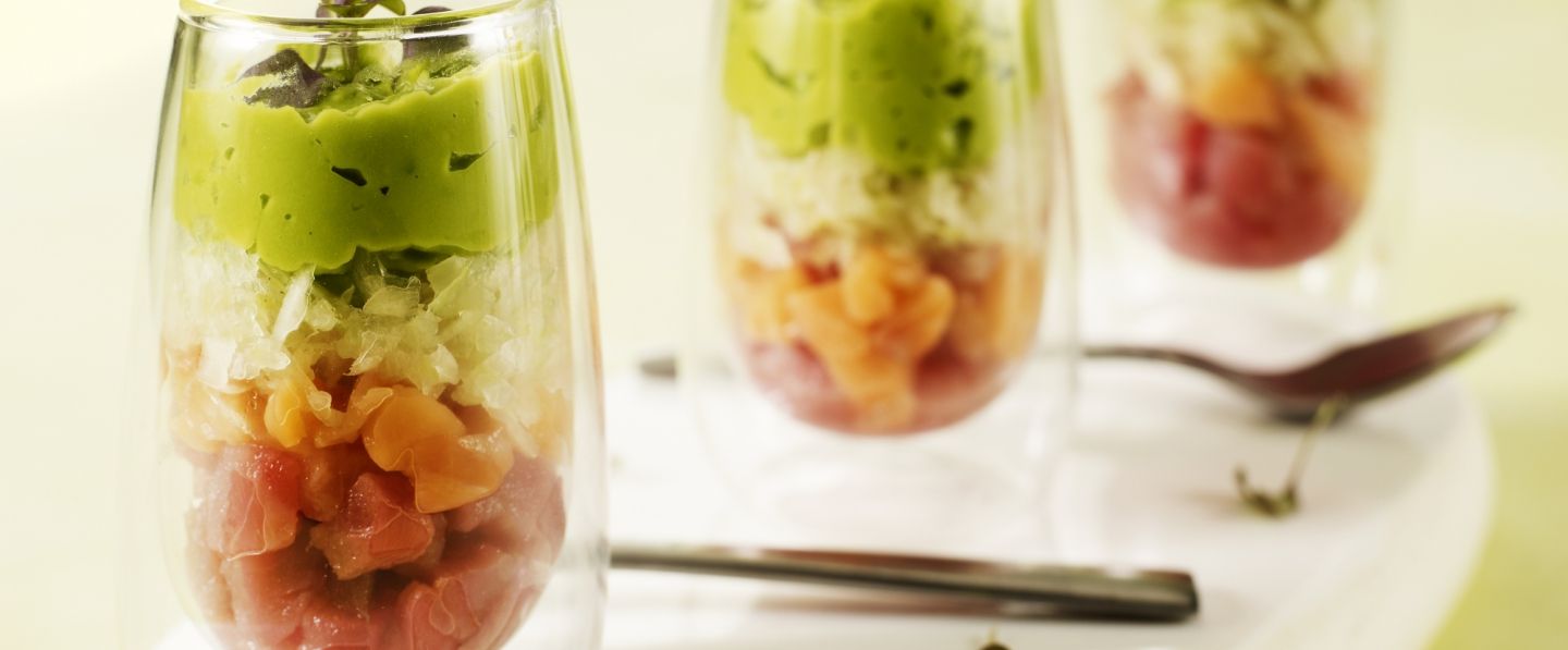 Nettoyer le fenouil et râper finement. Répartir le thon et saumon mariné dans des verres, ajouter ensuite le fenouil, puis le guacamole et terminer par quelques graines germées. Mettre au frais jusqu'au moment de servir.