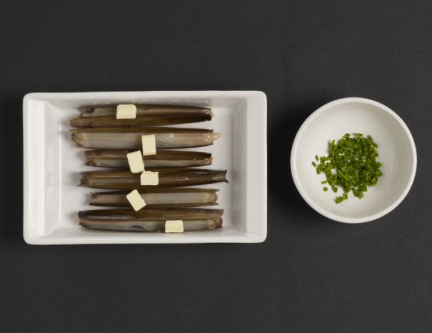FacileLaver les couteaux à l'eau froide pour enlever tous les résidus de sable. Disposer les coquillages dans un plat allant au four, la charnière dans le fond du plat. Ajouter une noisette de beurre sur chaque couteau et enfourner le plat en position grill. Quand les couteaux sont ouverts, les ôter du four. Réserver le jus de cuisson.