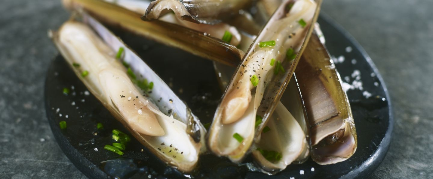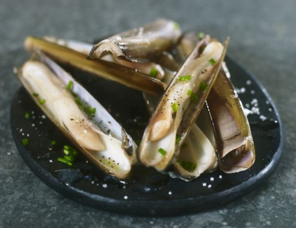 Disposer les couteaux sur de grandes assiettes plates, verser dessus le jus de cuisson. Donner un tour de poivre du moulin et parsemer de ciboulette. Servir aussitôt