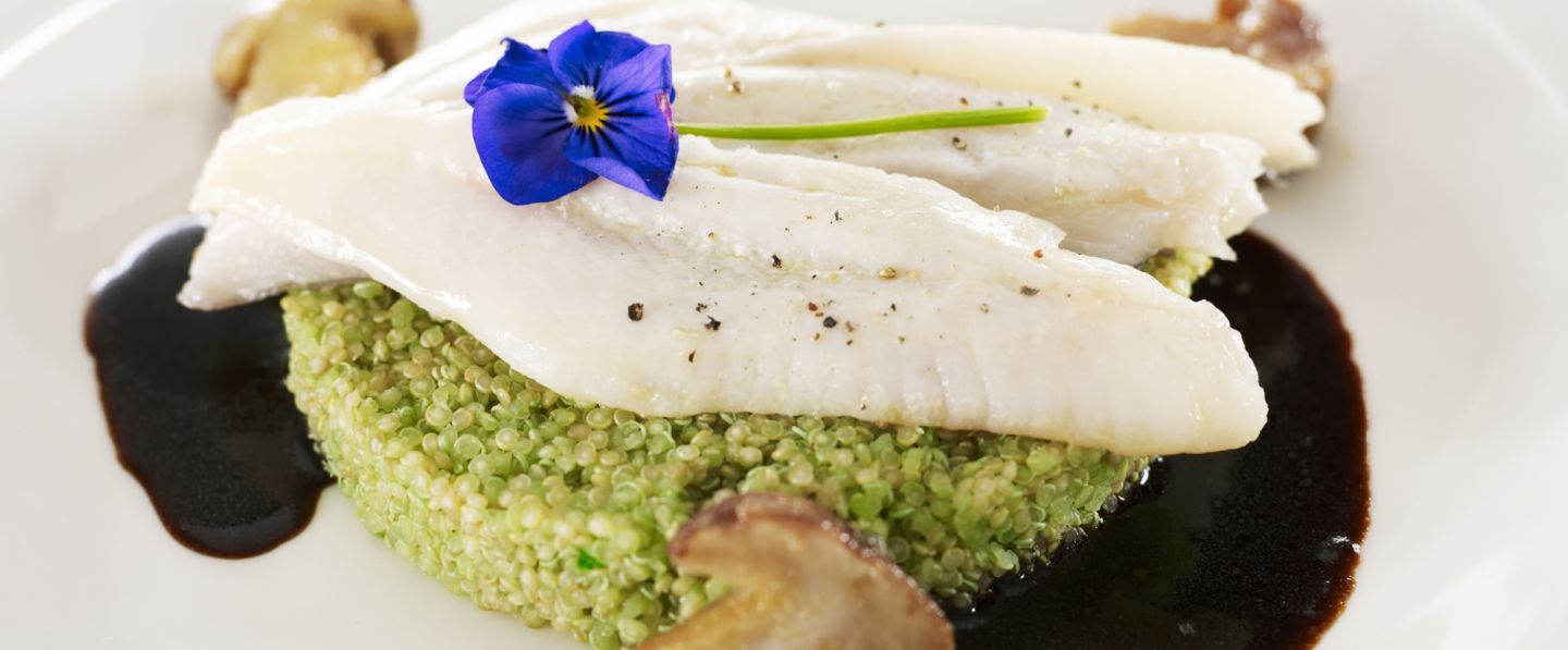 Dresser au fond d’un cercle le risotto de quinoas verts, disposer joliment les aiguillettes de Saint-Pierre, les cèpes et la fleur de Capucine. Terminer avec un cordon de sauce.