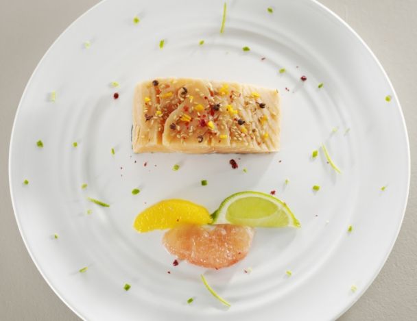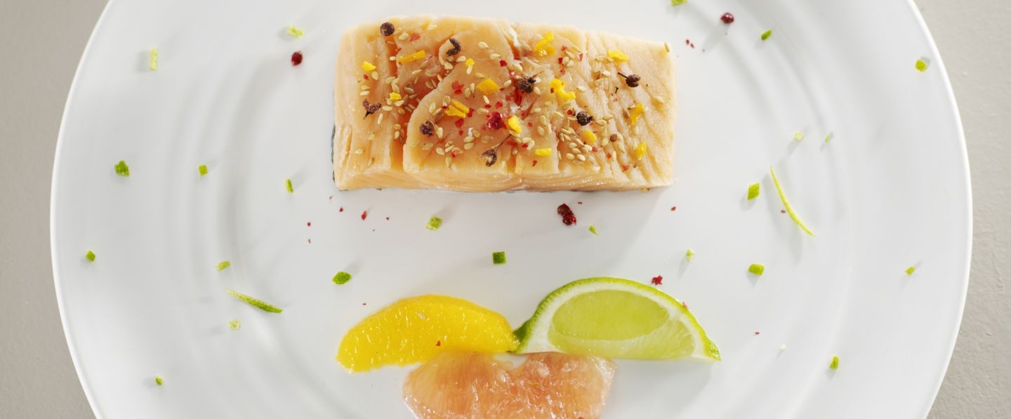 Tailler de fines tranches dans le filet de saumon, servir avec la vinaigrette aux agrumes.