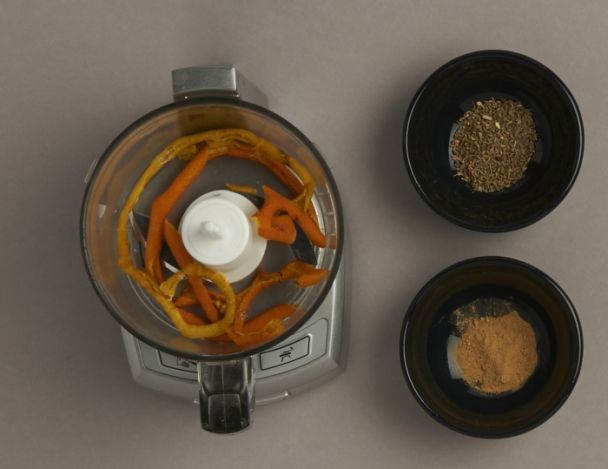 Le jour même: Mixer le poivre de Sichuan, les grains d’anis vert, le gingembre en poudre avec les citrons et les oranges séchées.