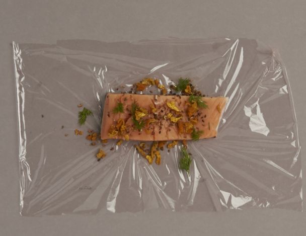 Rincer le filet de saumon sous un filet d’eau, égoutter et sécher avec une feuille de papier absorbant. Concasser l’aneth et mélanger avec le sésame torréfié et le mélange d’épices mixées. Couvrir la chair du saumon ce mélange. Envelopper le saumon dans du papier film et réserver au frais.