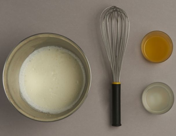 Travailler au fouet la crème épaisse, le jus de Yuzu et le jus d’une orange.