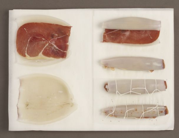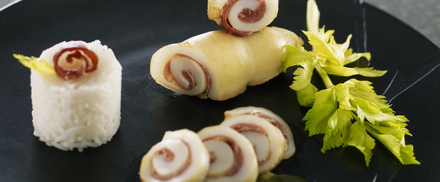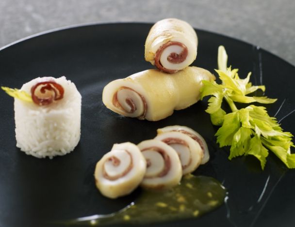 MoyenÉtaler les encornets sur une planche, et déposer sur chacun une tranche de jambon sec, puis les rouler en les serrant au maximum et les ficeler régulièrement afin d’avoir une belle cuisson ainsi qu’une belle tenue à la présentation. Les parsemer délicatement du piment que vous aurez choisi. Réserver.