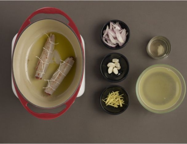 Chauffer la cocotte avec cinq cuillères à soupe d'huile d’olive, faire dorer les encornets sur toutes les faces, ajouter l’échalote, le gingembre et l’ail et faire suer cinq minutes puis déglacer avec le vin blanc, laisser réduire aux 3/4, ajouter le bouillon de volaille et cuire à frémissement 30 minutes à couvert pour que les calamars soient confits.