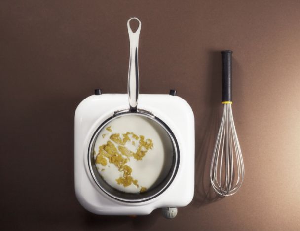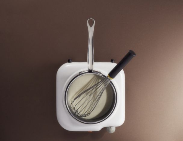 Ajouter le lait chaud en une seule fois et remuer énergiquement au fouet.