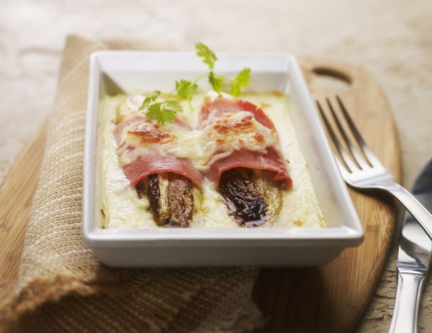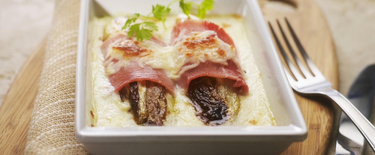 Enrouler chaque demi-endive dans une demi-tranche de jambon et déposer dans un plat à gratin.