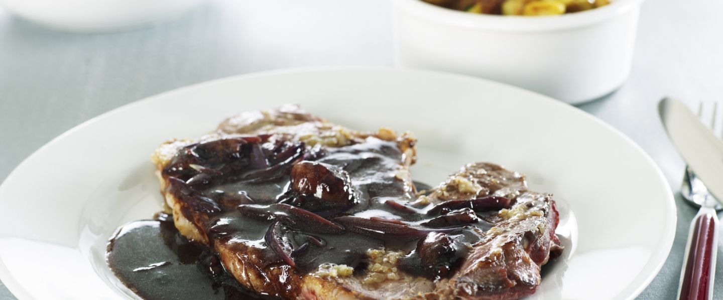 Napper le plat de service ou les assiettes de la sauce au vin rouge.