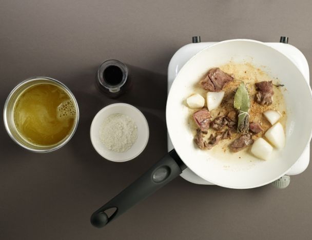 Faire revenir les parures de viande. Ajouter la garniture et faire suer le tout pendant 5 minutes avec 2 cuillères de farine. Remuer le tout, laisser cuire l’ensemble 2 minutes.